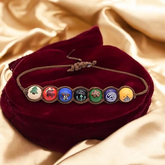 ✅ SYMBOLIC MEANING - The Camp Necklace is given to each Camp Half-Blood camper at the end of each summer at Camp Half-Blood. The head councilors vote on the biggest event of the year and paint it on a bead. The first bead represents Thalia's pine tree, the second bead features a centaur in a prom dress, the third bead depicts a Greek trireme on fire, the fourth bead shows Poseidon's trident, the fifth bead represents the Golden fleece, the sixth bead features Artemis's arrow, the seventh bead displays the labyrinth and the eighth bead represents the Empire State Building.